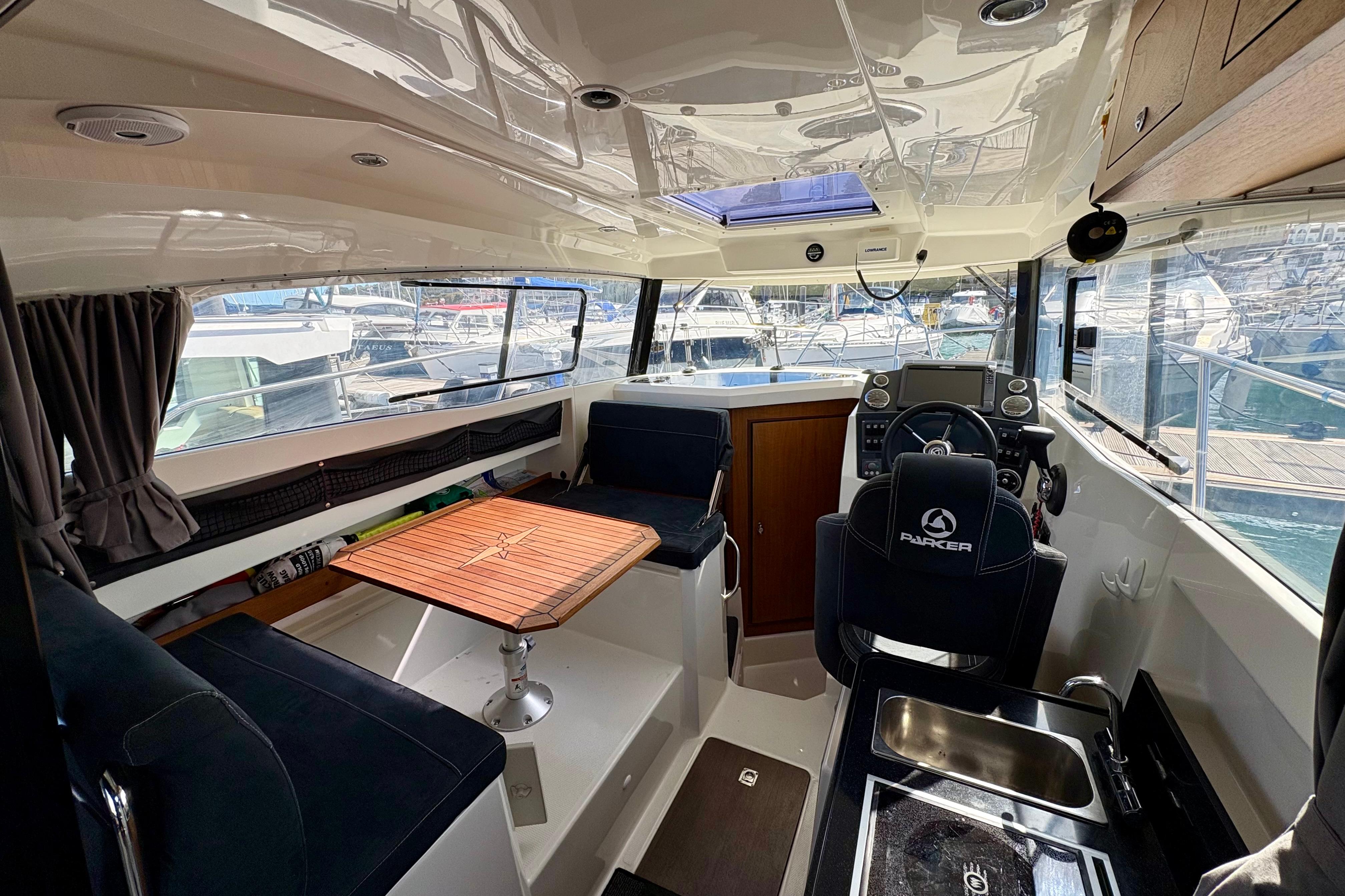 Spacious interior (will sleep up to six persons) with a bright, well-ventilated area with panoramic views. Comfort is optimised by a well-planned galley with plenty of storage lockers. In addition, there is also a separate cubicle with a sea toilet, hand wash basin and shower. The Parker 800 Weekend's hull has inherited its origins from the deep V hulls of the Parker ribs, ensuring excellent sea handling with a stable and dry ride, whatever the weather conditions.