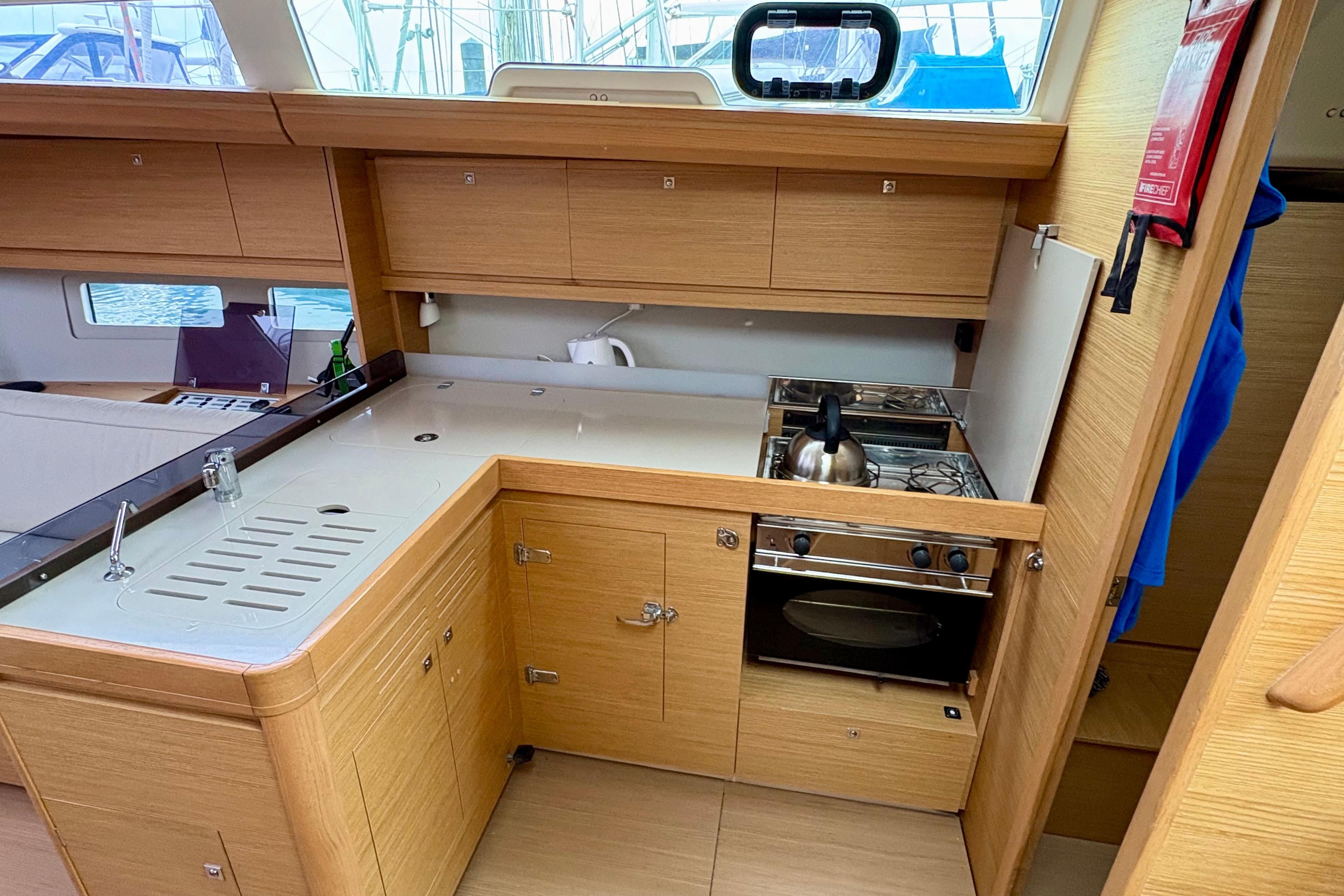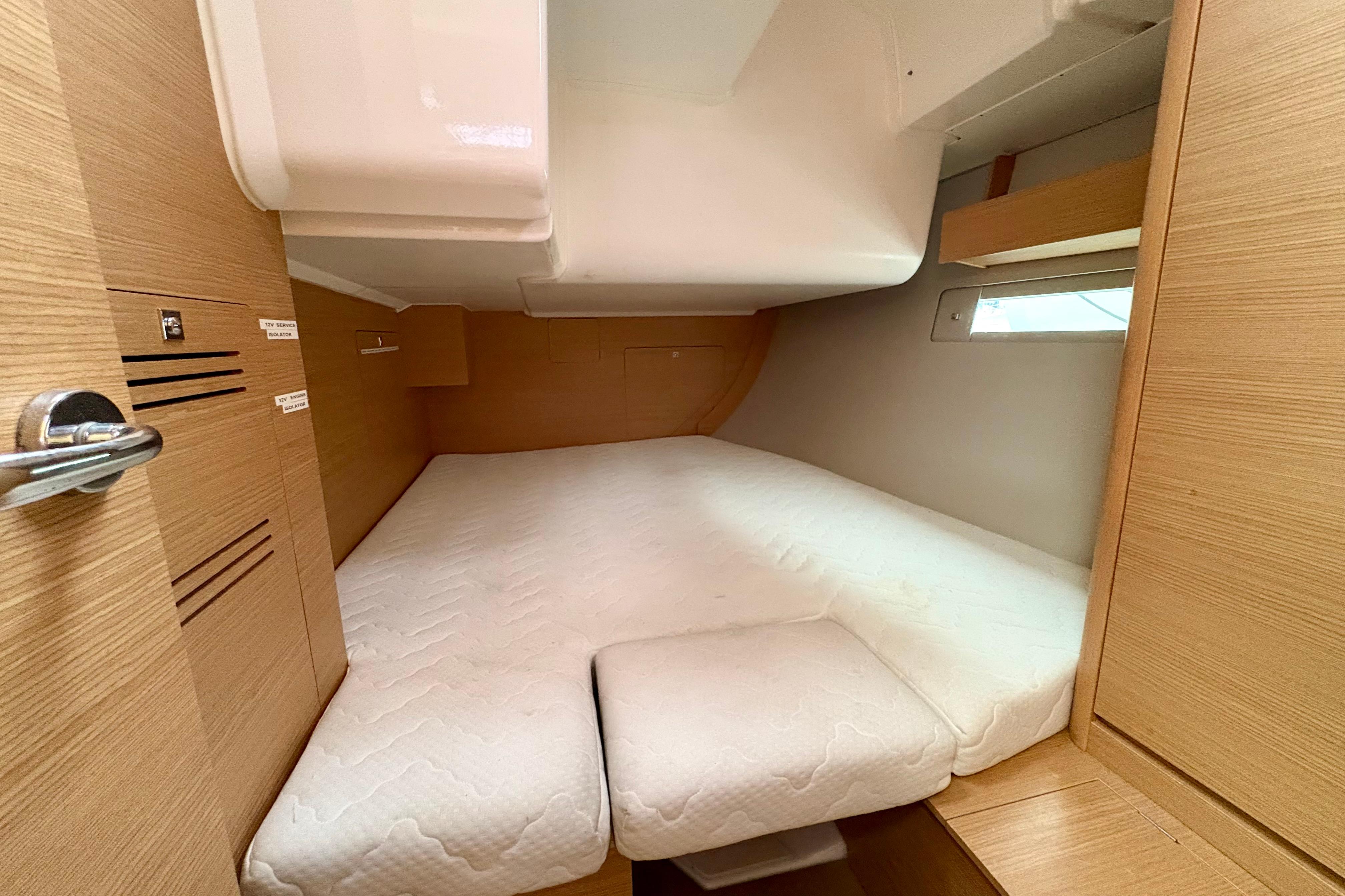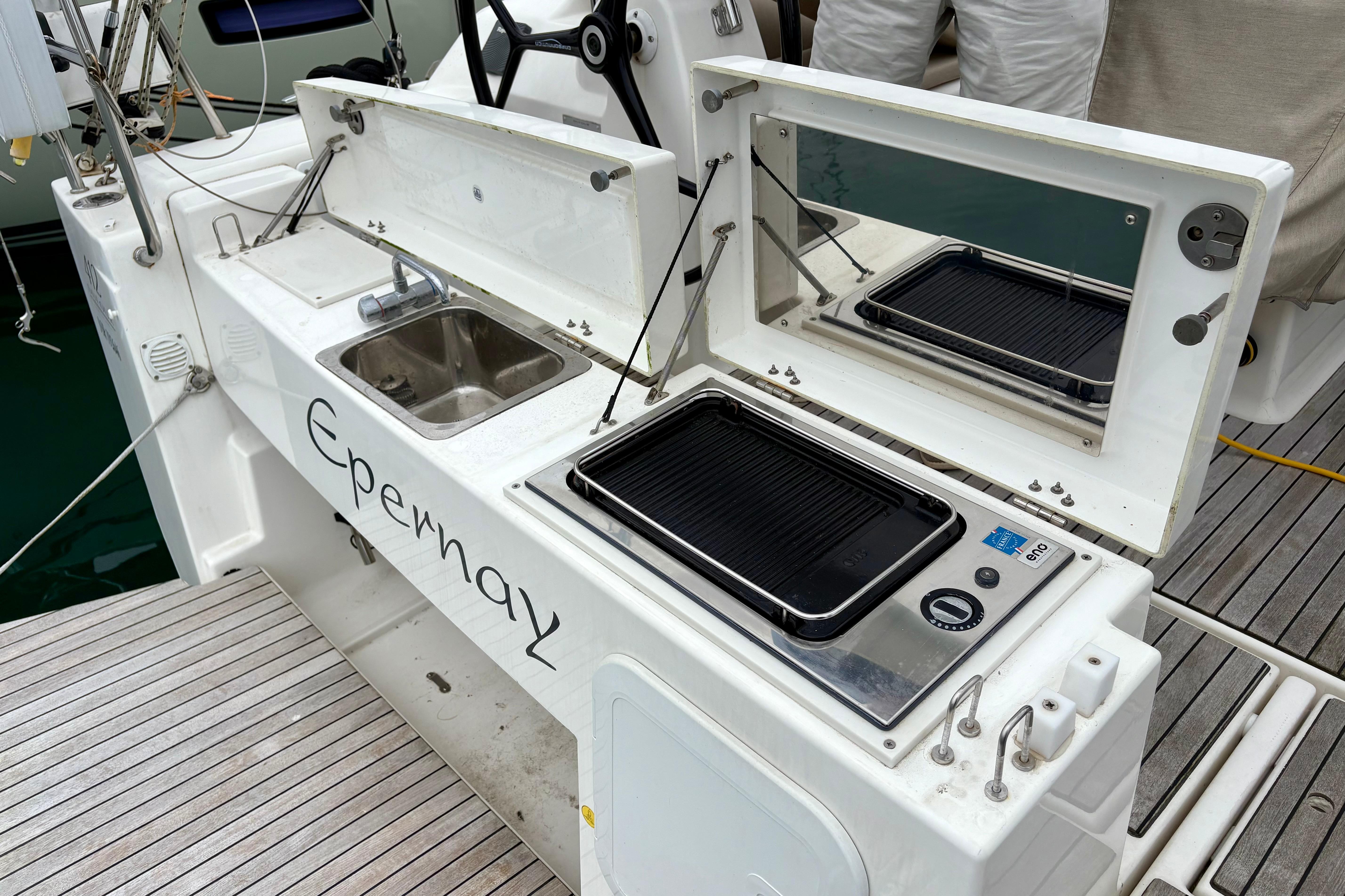The interior has been refreshed to offer maximum comfort. The living space and sunbathing area can be easily separated from the cockpit so that each passenger can find their own space on this stunning yacht and enjoy every moment of their cruise. The cockpit has a galley fully equipped with gas barbecue, sink and fridge.